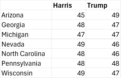 If we run the model using only the Times polls (and fiat non battleground states to the likely winner), Harris wins the election 58.3% of the time. The model printout is at the bottom.